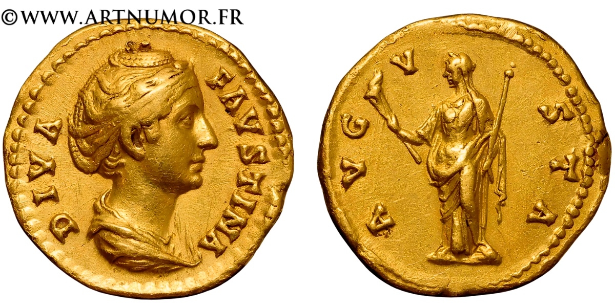 | Avers | Buste voilé et drapé de Faustine mère à droite avec les cheveux relevés, coiffés en chignon |