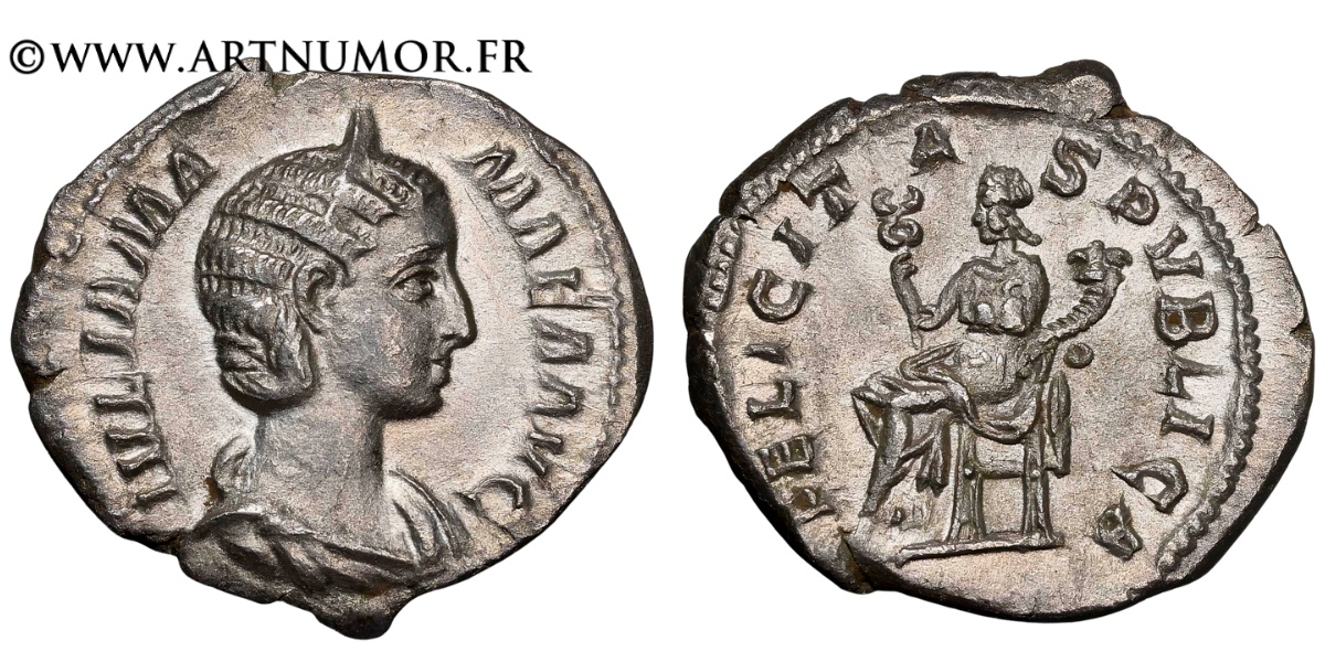 | Avers | Buste diadémé et drapé de Julia Mamée à droite |