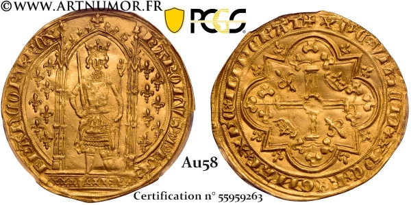 | Avers | Charles V, couronné, debout sous un dais gothique accosté de lis, portant une cotte d'armes fleurdelisée par-dessus sa cotte de mailles, tenant une épée de la main droite et la main de justice de la gauche |