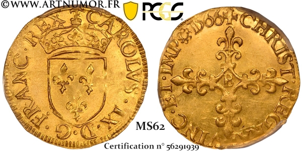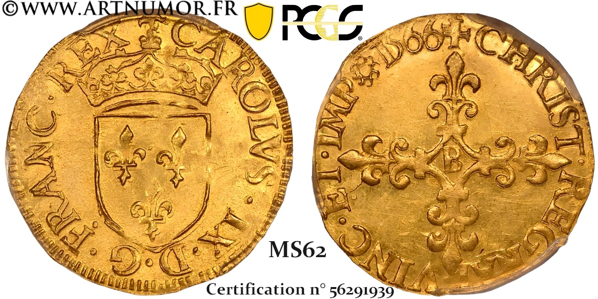 Charles IX - Ecu d'or au soleil, 1566 B Rouen | PCGS MS62