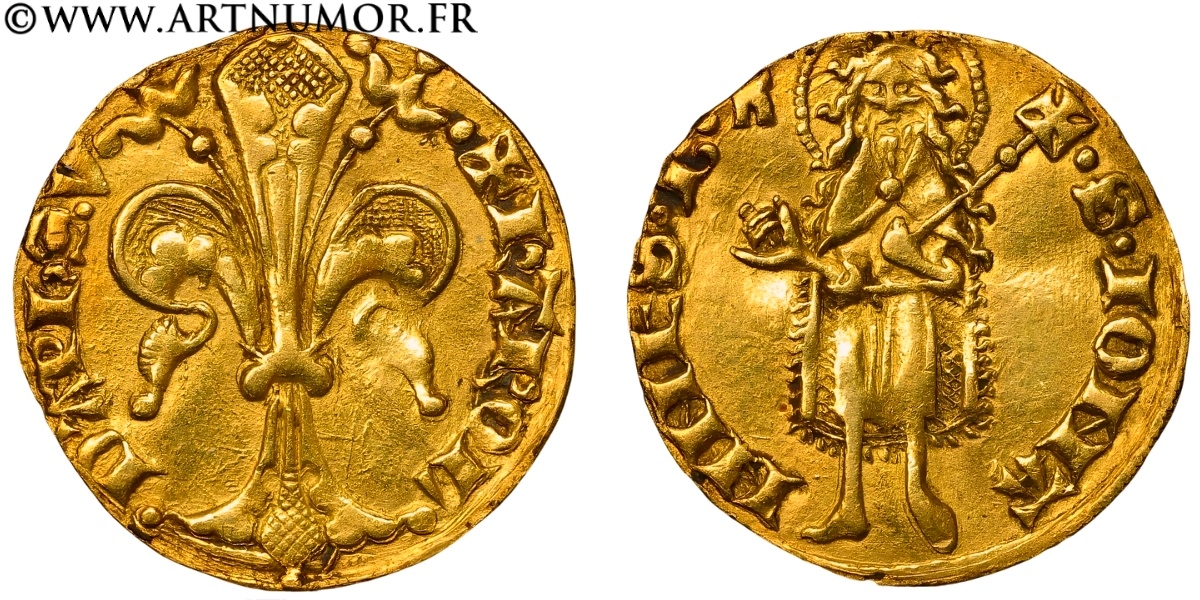 Revers | Saint Jean-Baptiste debout de face, nimbé, vêtu d'une peau de chameau, tenant un sceptre cruciforme avec annelet de la main gauche et bénissant de la main droite. |