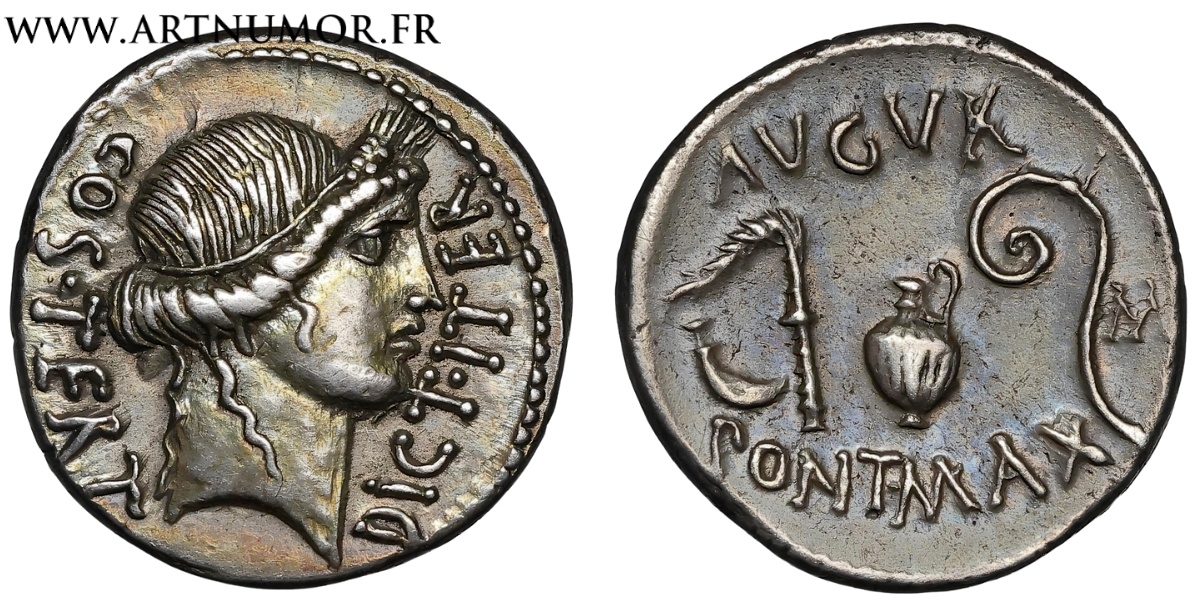 | Revers | Instruments pontificaux : simpulum, aspersoir, vase à sacrifice, et lituus ; dans le champ à droite, M. |