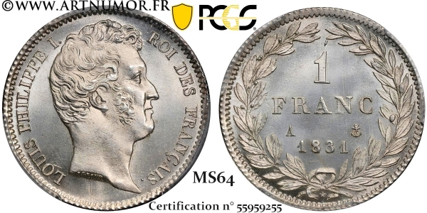 Louis Philippe I - 1 Franc tête nue, 1831 A Paris | PCGS MS64