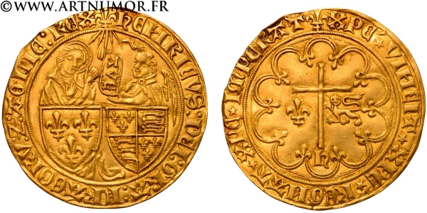 | Avers | L'archange Gabriel visitant la Vierge, les personnages sont vus à mi-corps et placés derrière les écus accotés de France et de France-Angleterre. |