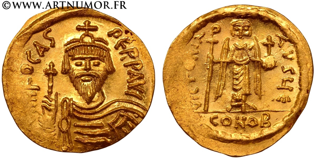 | Avers | Buste couronné, diadémé et cuirassé de Phocas de face, tenant un globe crucigère de la main droite. |