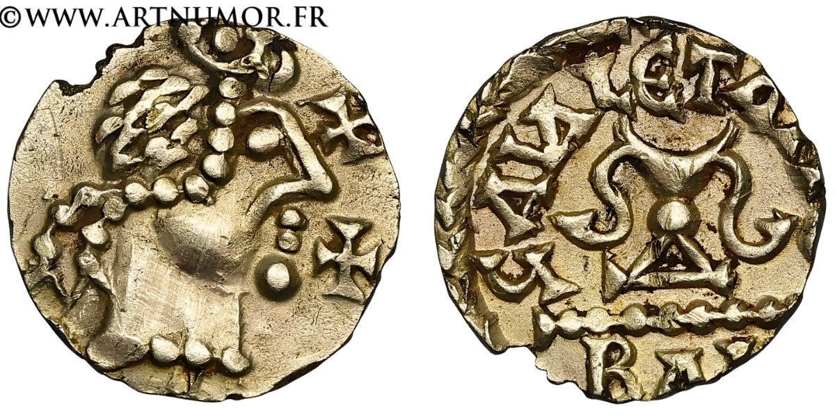| Avers | Tête barbare diadémée, à droite ; diadème perlé ; deux croisettes devant le visage. |