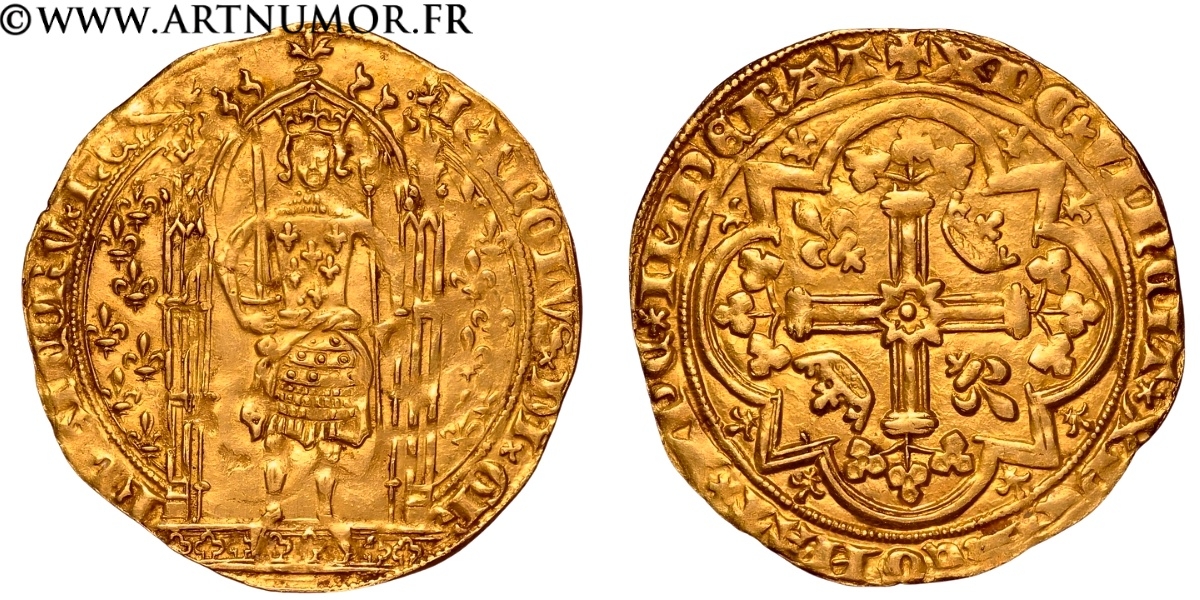 | Avers | Charles V, couronné, debout sous un dais gothique accosté de lis, portant une cotte d'armes fleurdelisée par-dessus sa cotte de mailles, tenant une épée de la main droite et la main de justice de la gauche |