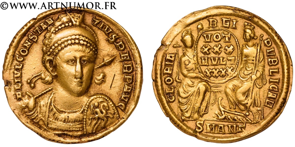 | Avers | Buste diadémé, casqué et cuirassé de Constance II auguste de face, tenant de la main droite la haste qui repose sur l'épaule et de la gauche, un bouclier orné d'un cavalier chargeant à gauche et terrassant un fantassin |