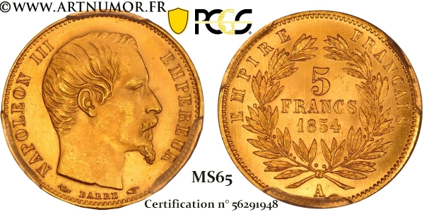 Napoléon III - 5 Francs "Petit Module", 1854 A Paris Tr.lisse | PCGS MS65